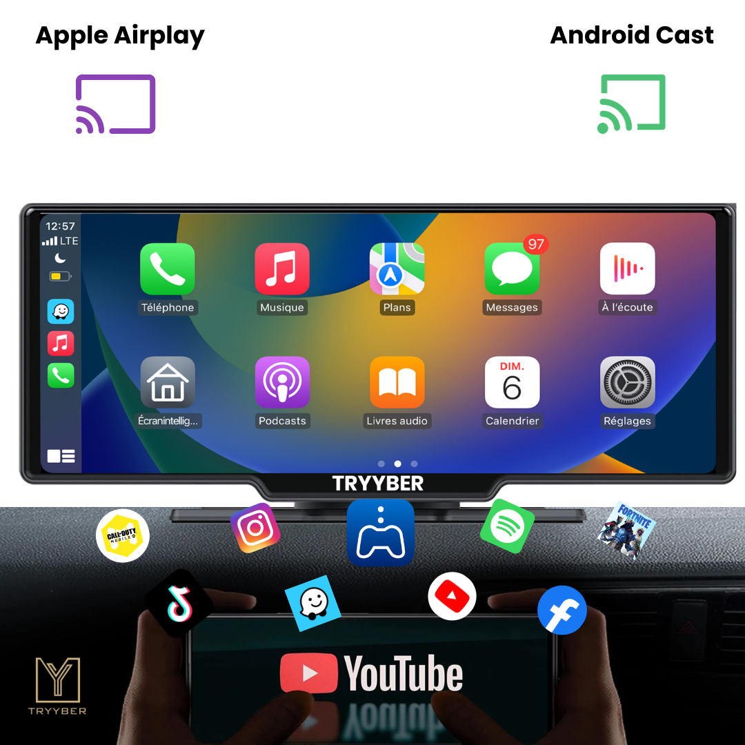 Avec AirPlay et Android Cast, projetez l’écran de votre téléphone sur votre Tryyber et transformez votre voiture en véritable salon mobile. Regardez vos films préférés sur l'écran ou jouez à votre console, tout cela, confortablement installé dans votre voiture.